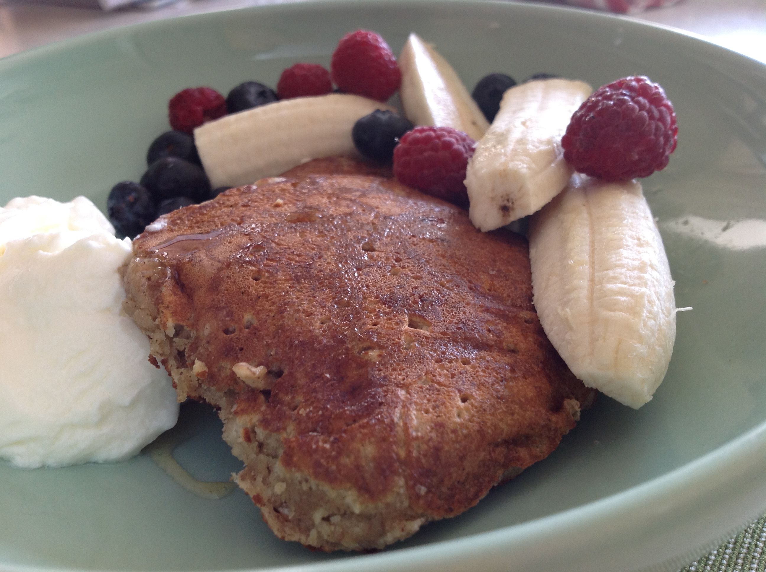 This morning I cooked breakfast. Oat hotcakes and ate them with fresh fruit and yoghurt. There is a wee bit o’ Scots in me so I was looking for a way to eat oats outside of porridge in winter. Here is the recipe.