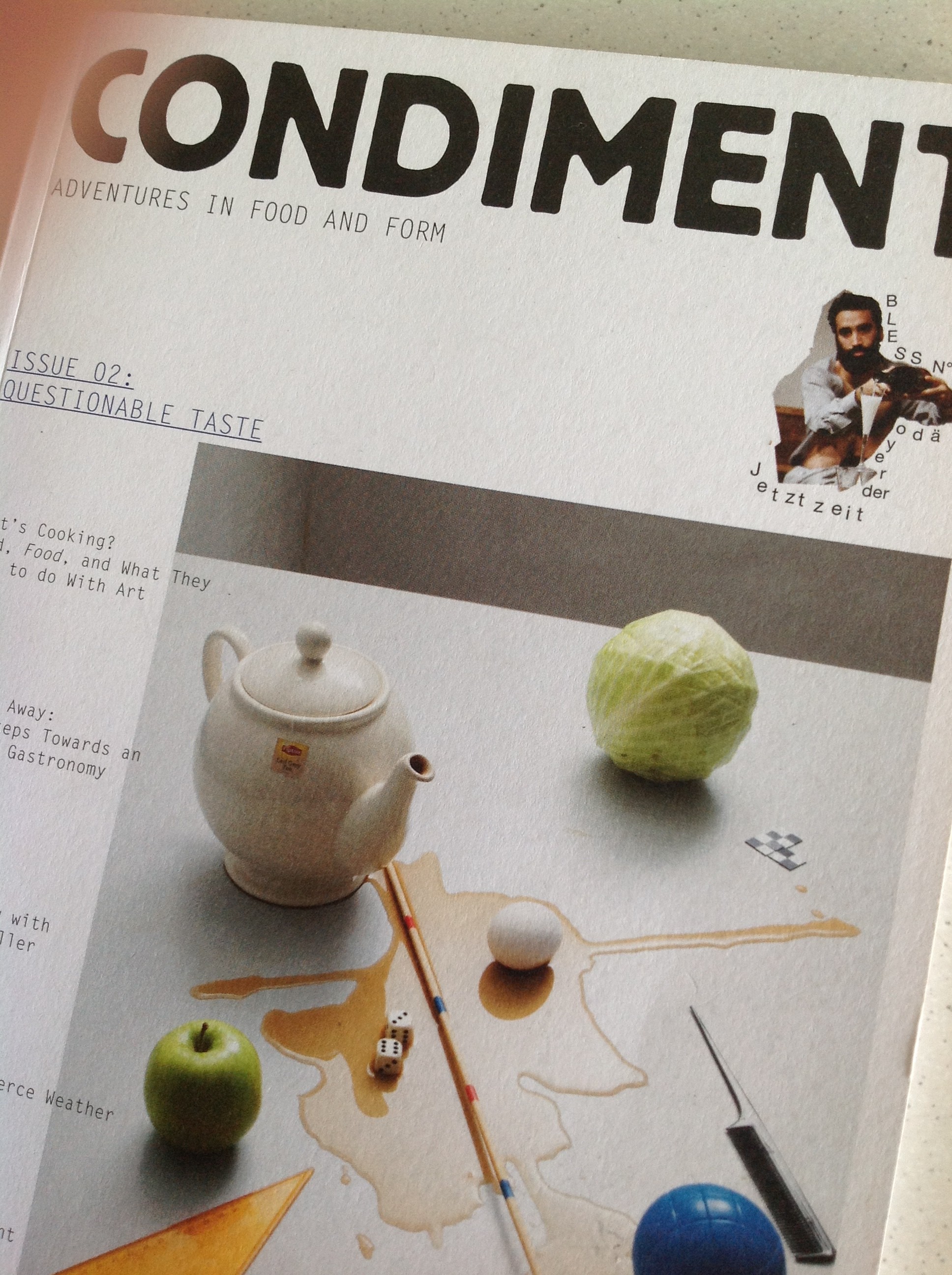 Condiment:Adventures in Food and Form, the most self-consciously arty of the magazines. Published out of Melbourne, the focus is relentlessly global with articles from Germany, Japan and the United States. The magazine is highly graphic with collages, photography and selected works by particular artists. The writing has a manifesto feel about it as the writers explore the far reaches of what is gastronomy. For example, Cameron Allan McKean, in his piece on walking towards an expanded gastronomy and ponders that ‘chemical and molecular science did not free food through molecular gastronomy, it tethered it to technology and abused it: a fearful overwrought approach to food.’ Like the other magazines, there is a desire to stretch the notion of what is food writing and to do this through exploring the links between food and art.