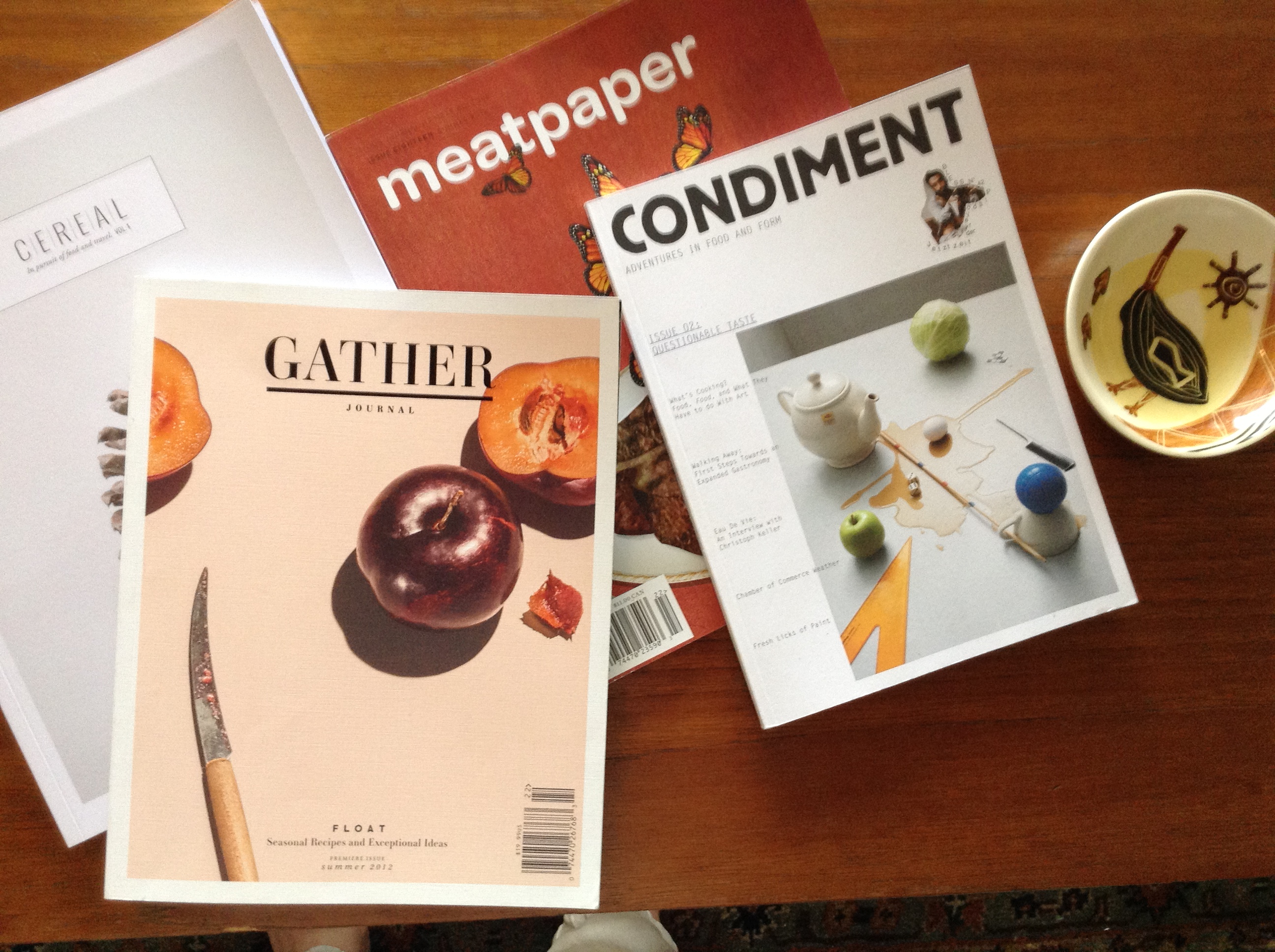 Gather is another substantial publication designed to sit on your shelf for some time. Printed in the US, it is seasonal and recipe based, with the first edition coming out in the Northern summer 2012. The journal follows the courses of a meal with chapters from Amuse Bouche and Cocktails through Starters, Mains and Desserts. The final chapter is on Salt and covers the many types and uses of salt as well as recipes for salty treats such as peanut brittle.